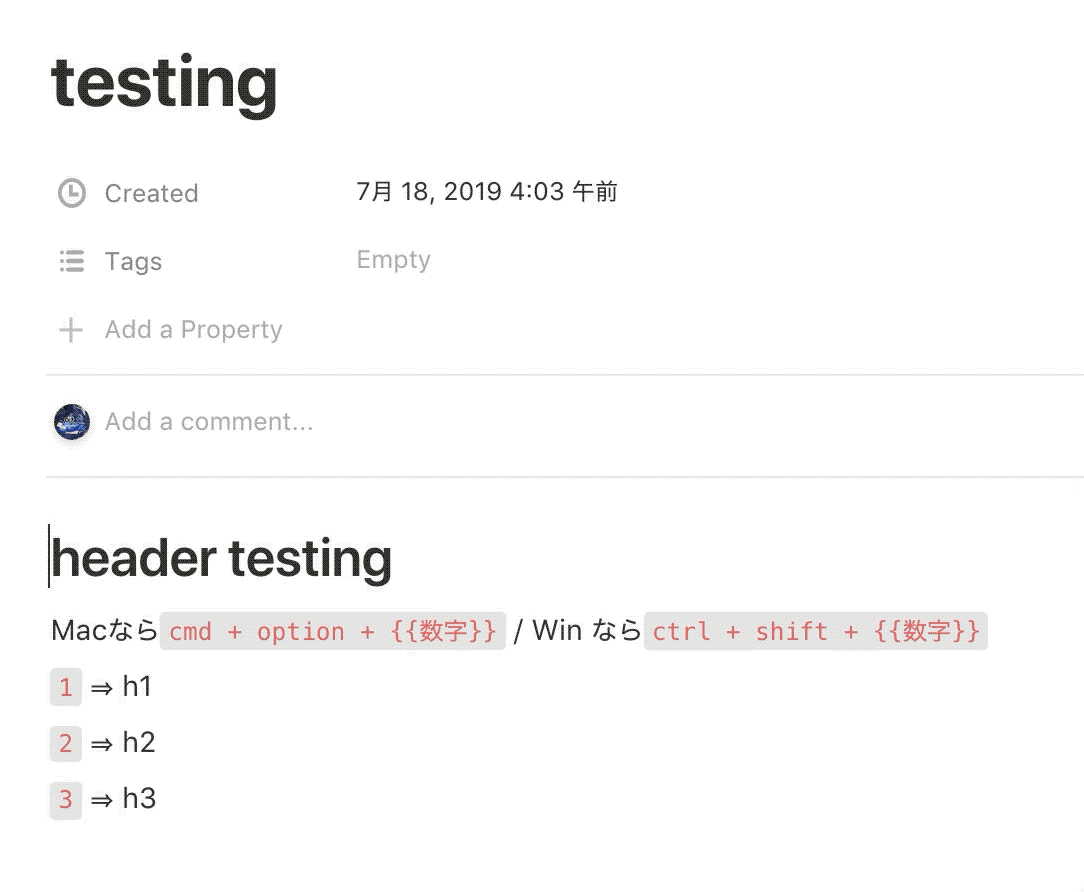 1であれば H1、2であれば H2 の要領です。その他の数字も動作しますが、あまり直感的に覚えられないので、それ以外はあまり利用しません。