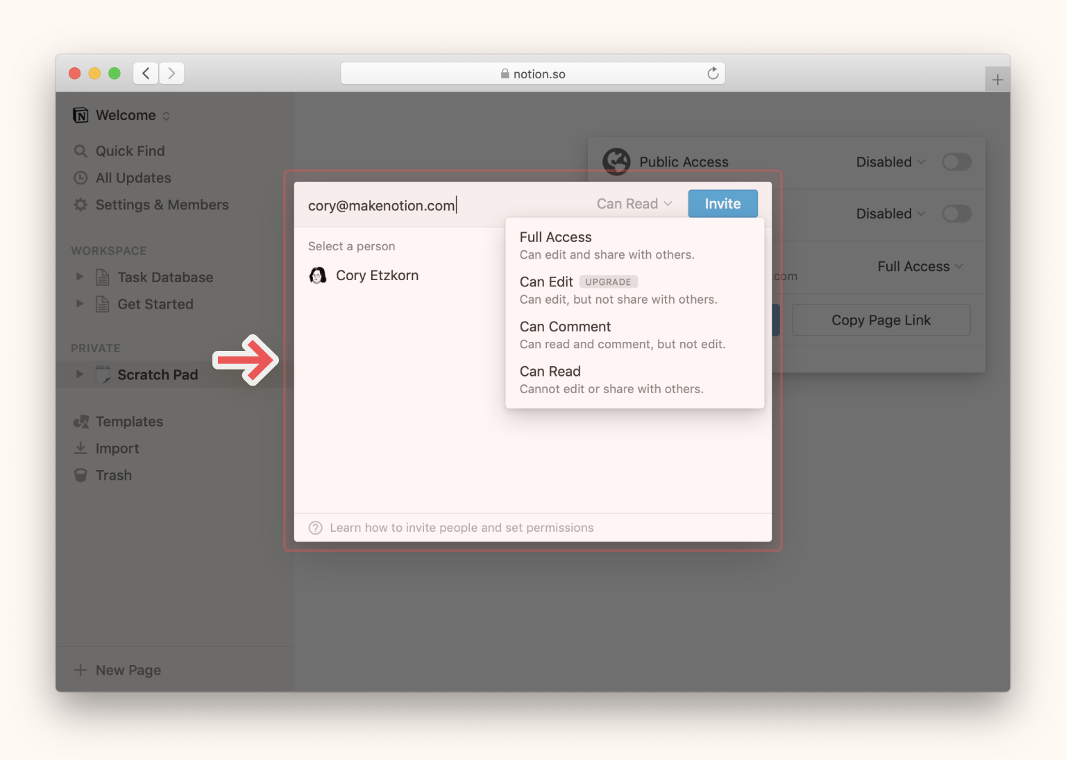 - 你也可以通过下拉框为现有 Notion 成员打开的访问权限