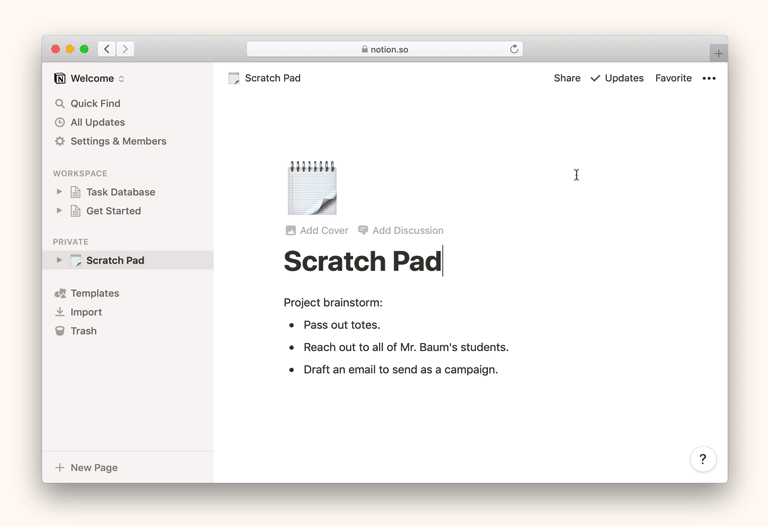 不论是否在你的工作站,你都可以邀请成员来与你分享 Notion 页面